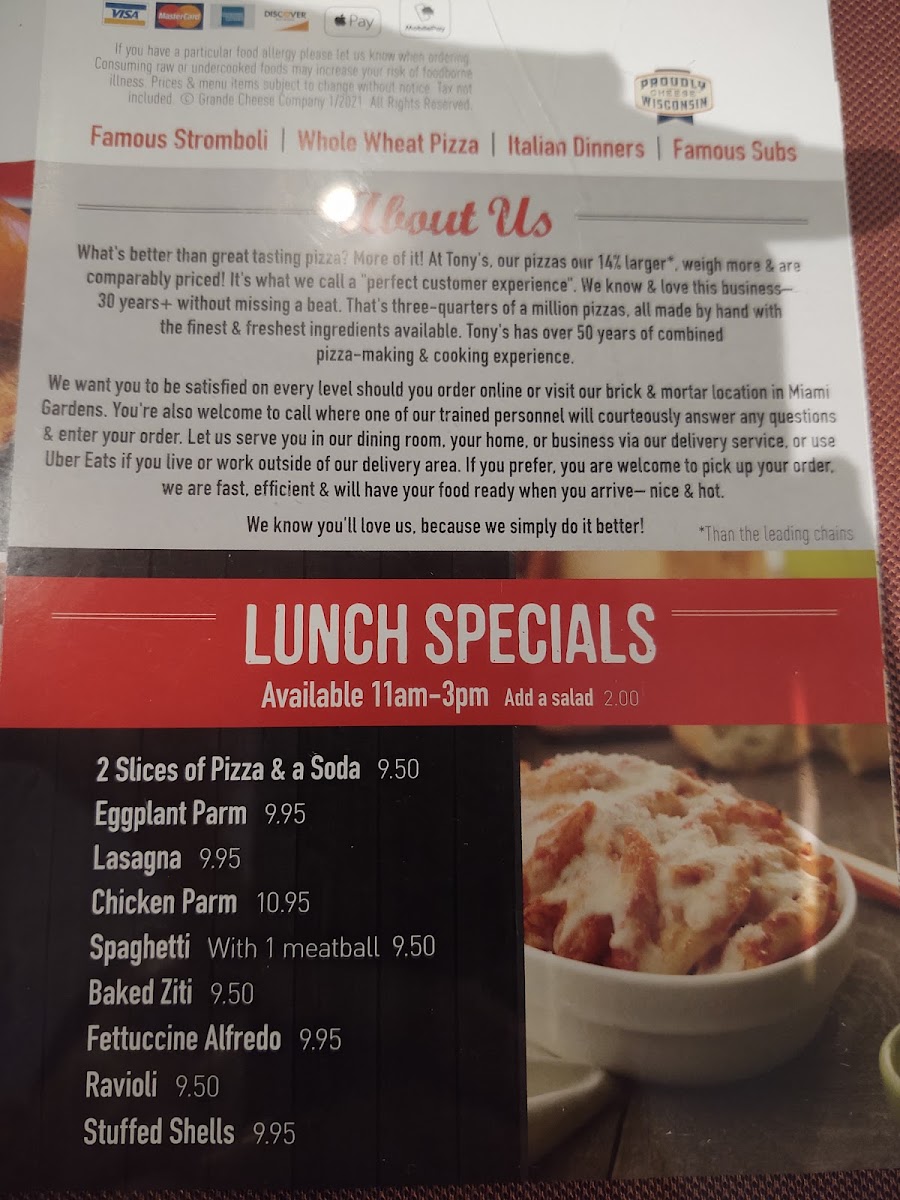 Welcome to Tony's Pizza - Miami, a hidden gem located at 19329 NW 2nd Ave. This cozy spot offers a menu that captures the essence of Italian-American comfort food. From the moment you step in, the vibe is relaxed, making it an ideal place for everything from solo dining to family gatherings.
